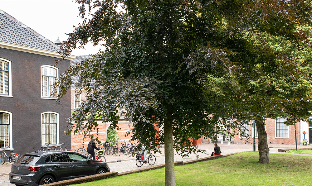 Op een ansichtkaart van begin 1900 is te zien dat de aan de Oude Kijk in ’t Jatstraat gelegen open ruimte als tuin is ingericht. Eind jaren zestig en begin jaren zeventig werd het gebruikt als parkeerterrein voor de Rijksuniversiteit, evenals het achter het gebouw gelegen gebied. Met een beetje passen en meten konden er circa 30 auto’s staan.