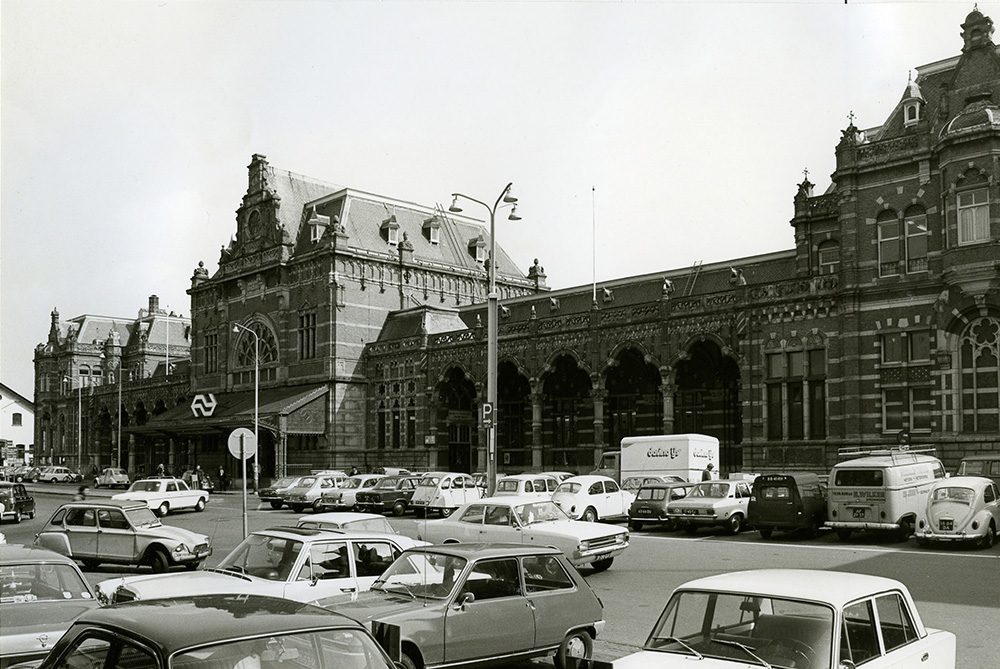In de jaren ’80 lag er direct voor de monumentale ingang van het Hoofdstation, zoals het station in de volksmond genoemd wordt, een flinke parkeerplaats voor meer dan honderd auto’s. Zo’n veertig jaar eerder werd het voorplein nog gesierd door de beginhaltes van een tweetal tramlijnen en iets later door geleide trollybussen. Nadat de bussen naar het oostelijke deel van het stationsgebied werden verplaatst, ontstond er alle ruimte voor autoparkeren. Dit was geheel in lijn met het snel toenoemende autogebruik en de aanpassing van de publieke ruimte daarop. In de jaren daarna transformeerde het gebied tot een chaotische opéénhoping van blik.